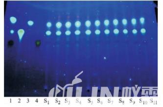 精密稱取五靈脂樣品(商州區(qū)3批,丹鳳縣3批,山陽 縣3批以及商州區(qū)野生2批)粉末(過四號篩)3.0g,置于索氏提取器中,加乙醚適量,加熱回流至提取液 無色,棄 去 乙 醚 液,藥 渣 揮 干 乙 醚,加 體 積 分 數(shù) 為 70%的乙醇50mL,加熱回流1h,趁熱濾過,濾液蒸 干,殘渣加水25mL使溶解,加鹽酸5mL,100 ℃加 熱水解 45 min,立 即 冷 卻,用 乙 酸 乙 酯 振 搖 提 取 3 次,每次20mL,合并乙酸乙酯液,用水洗滌3次,每 次20mL,水浴蒸干,殘渣加甲 醇10mL 使溶 解,作 為供試品溶液?精密稱取槲皮素?山柰素和穗花杉雙 黃酮對照品適量,加乙醇制成質(zhì)量濃度分別為0.1, 0.2和0.1mg·mL-1的混合對照品溶液,再精密稱 取槲皮素?山柰素和穗花杉雙黃酮對照品適量,加乙 醇制成質(zhì)量濃度分別為0.5,0.2和0.5mg·mL-1 的對照品溶液?分別吸取上述供試品溶液?混合對照 品溶液和對照品溶液各5μL,點于同一硅膠 G 薄層 板上,以甲苯-乙酸乙酯-甲酸(5∶2∶1)2~8 ℃的上 層溶液為展開劑,展開,取出,晾干,噴以10mL·L-1 的三氯化鋁乙醇溶液,置 于 紫 外 光 燈 365nm 處檢 視?供試品色譜中,在與對照品色譜相應(yīng)的位置上, 顯相同顏色的熒光斑點?見圖1。