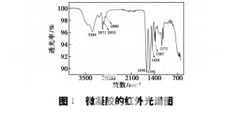微凝膠的紅外光譜圖如圖 1 所示。由圖 1 可以 看出,1 636 cm-1 處為 PNIPAM 中 C O 的伸縮振動 吸收峰; 1 541 cm-1 處為 PNIPAM 的 C—N—H 彎曲 振動吸收峰; 3 284 cm-1 處為酰胺基的 N—H 伸縮振 動吸收峰; 2 971、2 933、2 880 cm-1 分別為—CH3、 —CH2—、—CH 的伸縮振動; 1 458 cm-1 處為—CH3 的反對稱彎曲振動和—CH2 的對稱彎曲振動吸收 峰; 異丙基的 C—H 伸縮振動和彎曲振動相互作用, 在 1 387 cm-1 和 1 367 cm-1 處產生 2 個強度相似的 裂分峰,即證實了異丙基的存在。1 171 cm-1 處為異 丙基的 C—C 骨架伸縮振動吸收峰。