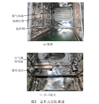 為橡膠密封條光觸媒除味設(shè)計(jì)的真空烘箱(上海精宏DZF-6090)如圖2所示,該烘箱的紫外光照射強(qiáng)度遠(yuǎn)遠(yuǎn)高 于正常太陽光的紫外光強(qiáng)度,且適應(yīng)橡膠密封條 的批量處理。烘箱中加熱燈管保證烘箱處于一定 的溫度范圍內(nèi),空氣循環(huán)風(fēng)扇保證空氣循環(huán)和烘 箱內(nèi)溫度分布均勻,紫外光燈分布在烘箱頂部和 兩側(cè),保證橡膠密封條在處理過程中被全面照射, 提高處理效率。