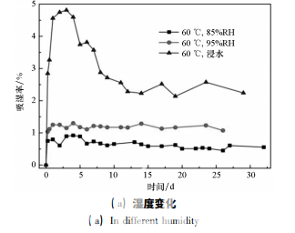 圖 1 為面板復合材料試樣在不同吸濕環(huán)境中 的吸濕率 - 時間曲線。從圖中可見,五種吸濕環(huán) 境中,面板復合材料的大部分吸濕都集中在吸濕 初期的 24 h 內,即吸濕初期吸濕率快速增加,隨 后吸濕率有所波動,最終都到達平衡。不同濕度 環(huán)境中( 見圖 1( a) ) ,面板復合材料的吸濕行為 相差很大,環(huán)境的濕度越大,試樣的吸濕速率和飽 和吸濕率也越大,85% RH、95% RH 和浸水三種濕 度下面板的飽和吸濕率分別為 0. 57% 、1. 18% 、 2. 36% 。同時發(fā)現(xiàn),在高濕度環(huán)境 85% RH、95% RH 中,面板復合材料的吸濕率波動較小,而浸水 環(huán)境中面板復合材料的吸濕率有明顯的下降,這 是由于浸水環(huán)境更為惡劣,浸水對面板復合材料 的損傷更大,使試樣表面溶解和剝落等質量損失 的程度和范圍大于高濕度環(huán)境,且面板復合材料 本身質量較小,在吸濕率曲線上表現(xiàn)為吸濕率顯 著下降。不同溫度環(huán)境中( 見圖 1 ( b) ) ,面板復 合材料的吸濕率曲線更加相近,吸濕速率沒有明 顯的規(guī)律,吸濕后期都有部分波動,其中 70 ℃ 時 面板復合材料的吸濕率下降最多,其次為 60 ℃環(huán) 境下的,50 ℃ 環(huán)境下試樣的吸濕率穩(wěn)定上升,沒 有明顯的下降過程。這可能是因為環(huán)境溫度越 高,吸濕過程中材料的剝離、脫粘等不可逆損失越 多。最終50 ℃、60 ℃、70 ℃三種環(huán)境中面板復合 材料 的 飽 和 吸 濕 率分別為 0. 85% 、0. 57% 、 0. 51% ,三個飽和吸濕率較為接近。與環(huán)境溫度 相比,濕度對面板復合材料吸濕行為的影響更大。