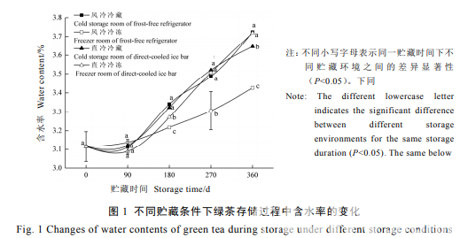 茶葉含水率是影響茶葉品質(zhì)的關(guān)鍵因素。由圖 1 可知,各貯藏環(huán)境下的茶葉含水 率均隨著存儲(chǔ)時(shí)間的延長(zhǎng)而增加,其中 90~360 d 貯藏期內(nèi)的茶葉含水率變化幅度較 大,而風(fēng)冷冷凍的含水率增幅最小。貯藏 360 d 時(shí),風(fēng)冷冷凍的含水率最低(P<0.05),為 3.42%,與原樣相比僅增加 9.94%,風(fēng)冷冷藏 和直冷冷凍的含水率為 3.72%,最高于其他兩 種(P<0.05),與原樣相比增加 19.23%。由此 可知,綠茶長(zhǎng)期貯藏時(shí),風(fēng)冷冰箱中的冷凍室 最有利于茶葉原含水率的保持,其余貯藏條件 的含水率相對(duì)較高,但也均在茶葉合理的含水 率范圍內(nèi)(小于 5%)。在茶葉起始含水率 相同的情況下,其貯藏過(guò)程中水分對(duì)其品質(zhì)的 影響主要來(lái)自于環(huán)境濕度,環(huán)境濕度在 10%~45%時(shí),茶葉增濕最小,風(fēng)冷冰箱和 直冷冰吧均達(dá)到此要求,區(qū)別在于風(fēng)冷冰箱通 過(guò)風(fēng)扇強(qiáng)制空氣進(jìn)行制冷,空氣流動(dòng)性大,直 冷冰吧則通過(guò)蒸發(fā)器進(jìn)行自然對(duì)流,故同為冷 藏室環(huán)境濕度前者波動(dòng)范圍(25%~45%)小 于后者(34.1%~34.5%),即直冷冰吧更能精 確的控制濕度。各貯藏環(huán)境下茶葉含水率的變 化與冰箱、冰吧自身的制冷方式不同導(dǎo)致微域 環(huán)境的差別有關(guān)。