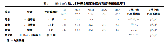 先 證 者 α-地中海貧血基因檢測 出--SEA/--THAI雙重雜合突變,β-地中海貧血基因17種 位點突變檢 測 未 見 異 常。先 證 者 母 親α-地 中 海 貧 血 基因檢測出--THAI/αα雜合突變,β-地中海貧血基因17 種位點突變 檢 測 未 見 異 常。先 證 者 父 親 α-地 中 海 貧 血基因檢 測 出--SEA/αα雜 合 突 變,β-地中海貧血基因 17種位點突變檢測未見異常。先證者兄長α-地中海 貧血基因檢測未見異常,β-地中海貧血基因17種位點 突變檢測未見異常。