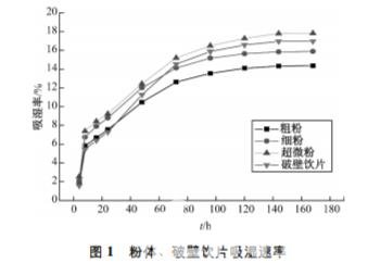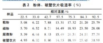 表 2 顯示,25 ℃ 下超微粉 吸濕速率最大,低濕度下破壁飲片吸濕速率小于粗粉和細(xì) 粉,中濕度下破壁飲片、粗粉、細(xì)粉吸濕速率相近,高濕 度下破壁飲片大于粗粉和細(xì)粉,表明破壁飲片吸濕速率受 環(huán)境濕度影響較大,產(chǎn)品長(zhǎng)期貯存時(shí)應(yīng)配置干燥劑。
