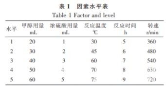 固定小球藻藻粉的質(zhì)量為 5 g, 選取甲醇用 量、催化劑(濃硫酸)用量、反應(yīng)溫度、反應(yīng)時間和 攪拌速度為試驗因素,每個因素考察 5 個水平,采 用 L25(56 )正交試驗表設(shè)計正交試驗,分析比較不 同條件下小球藻生物柴油的產(chǎn)率。 表 1 為因素水 平表。