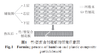 按幅面尺寸為350 mm×350 mm×14 mm,目標密 度為(660±20)kg/m3 壓制三層結構竹/塑復合刨花 板。分別稱取定量的竹刨花、UF膠和PE粉末。首先, 將竹刨花按照1:8:1 的比例分成3 份,分別用于刨花板 的上中下三層;其中,PE粉末僅在芯層添加,在添加之 前,先將質量分數(shù)為0.3%的KH560 均勻噴灑在PE粉 末上面,然后將處理后的PE粉末加入芯層竹刨花中混 合均勻,再對上中下層的竹刨花分別均勻施膠;人工分層均勻鋪裝(見圖1);預壓;在2.5 MPa的壓力條件下 熱壓成型,并靜養(yǎng)48 h;最后制備試樣。