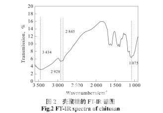 將殼聚糖粉末與溴化鉀粉末按照約 1∶200 的 比例混合研磨, 然后迚行壓片,將得到的片狀樣品 迚行 FT-IR 測試,對數據整理后,得到圖 2。