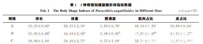 1)不同規格的擬鰻副鰍,其形體指標隨規格的增大,均呈現先增大后下降趨勢,中等規格的鰻鰍肌肉占 體質量比例最高.